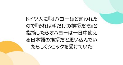 ドイツ人に『オハヨー!』と言われたので『それは朝だけの挨拶だぞ』と指摘したらオハヨーは一日中使える日本語の挨拶だと思い込んでいたらしくショックを受けていた