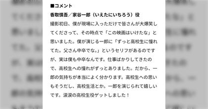 実写版の高校生家族、一郎役が香取慎吾ってあんま合わないな…と思ってたけど、実際に中卒で高校生に憧れてたことをインタビューで語ってて見る目変わった