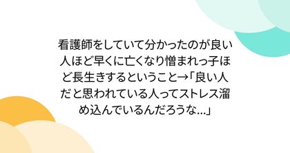 看護師をしていて分かったのが良い人ほど早くに亡くなり憎まれっ子ほど長生きするということ→「良い人だと思われている人ってストレス溜め込んでいるんだろうな...」