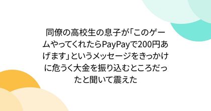 同僚の高校生の息子が「このゲームやってくれたらPayPayで200円あげます」というメッセージをきっかけに危うく大金を振り込むところだったと聞いて震えた